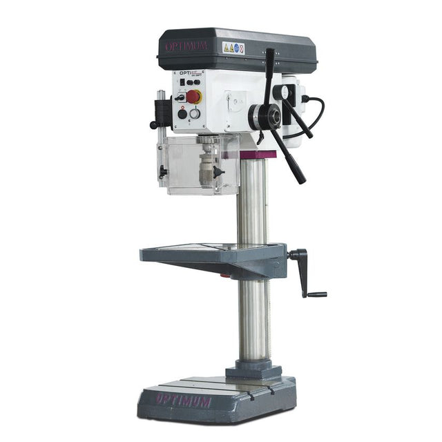 Powerful brushless drive with particularly smooth running, as well as high performance with approximately constant torque over the entire speed range. Best power transmission through aluminium pulleys in combination with toothed gates quality wedge belt. High smoothness thanks to ground multi-tooth handle. Concentricity guaranteed to be less than 0.015mm measured in the drill. Separate emergency stop switch. Digital speed display integrated in the housing. High quality Optimum quick release drill chuck as standard. Large sized height adjustable protective screen with safety switch for maximum protection of the user. Drilling depth stop. V-belt cover with safety switch. V-belt clamping device. Right/Left run. Machine light in the drill head integrated. Precisely worked, stable drilling table with 2 diagonally running T-slots 360 rotatable and circumferential cooling water channel. Thick walled casting column. Massive base plate.