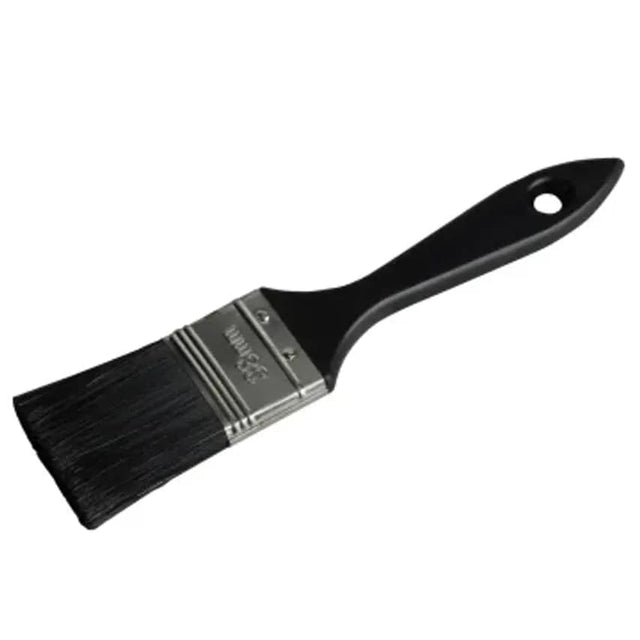 An economy-grade paint brush with black synthetic bristles, a steel ferrule and a plastic handle.