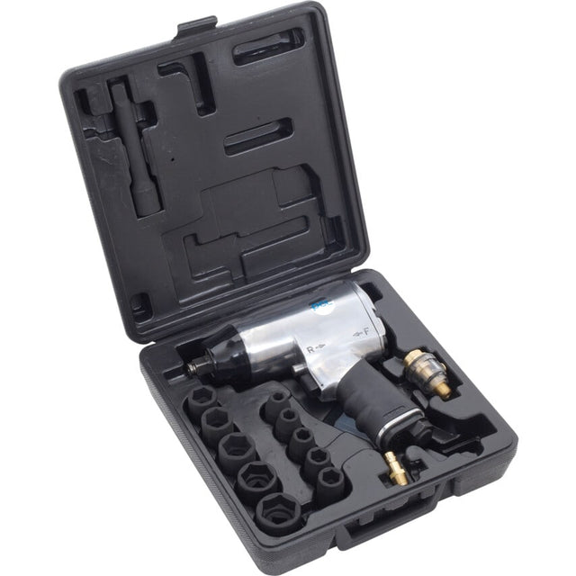 This air powered PCL impact wrench is a durable, lightweight tool with a max torque of 540 Nm. It features a pin clutch hammer mechanism and forward/reverse modes. Air power from an air compressor allows the tool to work at continuously high performance for longer. This PCL set comes in a tough carry cases, and features 10 chrome vanadium sockets along with the impact wrench. Features and Benefits At 2kg, this lightweight tool is easy to use for prolonged periods Ergonomic handle ensures comfort and safety Excellent power to weight ratio Balanced, smooth performance Typical Applications This tool is ideal for general purpose, medium duty use in busy workshops and factory settings Kit Contents x1 APT205 1/2" Impact Wrench x10 Chrome Vanadium Impact Sockets 9, 10, 11, 13, 14, 17, 19, 22, 24, 27mm x1 5 in / 125 mm Extension Bar x1 Mini oiler x1 25ml Air Tool Oil