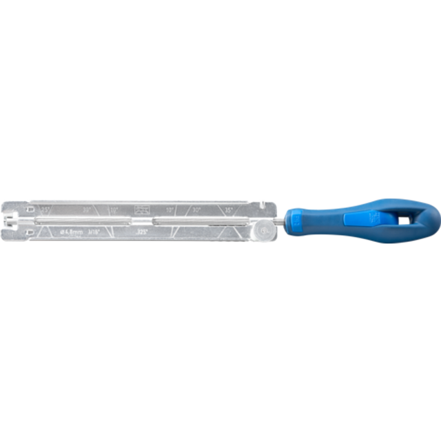 The PFERD product range includes sharpeners for both manual and mechanical sharpening of saw chains. Sharpeners from PFERD stand out due to their long tool life and ease of use. Chain saw sharpeners from PFERD are exceptionally well-suited to the manual sharpening of saw chains. Manual sharpening is more economical and much more gentle than machine-based sharpening, and prolongs the operating life of the saw chain if resharpened at an early stage. The handy CHAIN SHARP CS-SL sharpening gauge combines a chain saw file and a gauge in one ergonomic tool. The defined elevation of the chain saw file makes sharpening the saw teeth easier and prevents the connecting links of the saw chain from being damaged. The gauge supports consistent sharpening results by providing the correct sharpening angle. The sharpening gauge comprises a Classic Line chain saw file with an ergonomic file handle and a gauge.