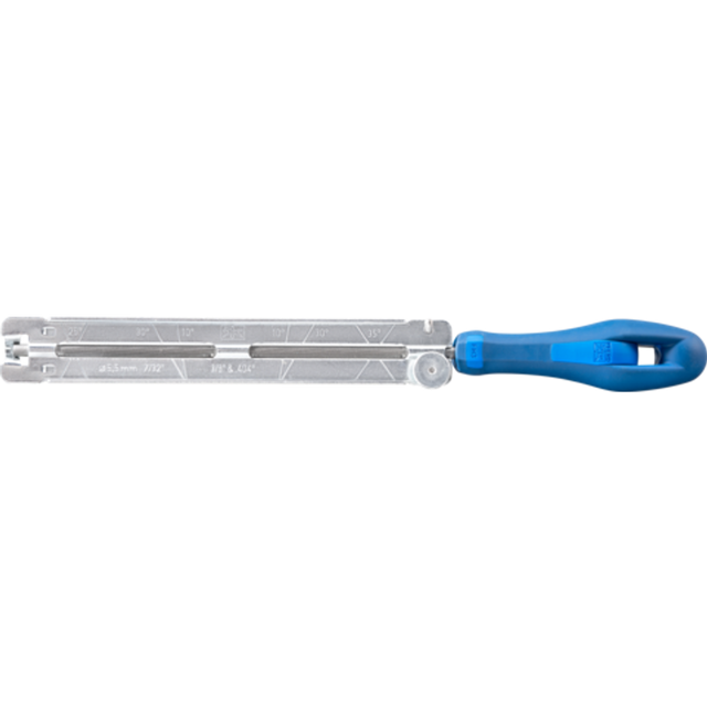 The PFERD product range includes sharpeners for both manual and mechanical sharpening of saw chains. Sharpeners from PFERD stand out due to their long tool life and ease of use. Chain saw sharpeners from PFERD are exceptionally well-suited to the manual sharpening of saw chains. Manual sharpening is more economical and much more gentle than machine-based sharpening, and prolongs the operating life of the saw chain if resharpened at an early stage. The handy CHAIN SHARP CS-SL sharpening gauge combines a chain saw file and a gauge in one ergonomic tool. The defined elevation of the chain saw file makes sharpening the saw teeth easier and prevents the connecting links of the saw chain from being damaged. The gauge supports consistent sharpening results by providing the correct sharpening angle. The sharpening gauge comprises a Classic Line chain saw file with an ergonomic file handle and a gauge.