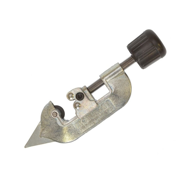 High quality adjustable, copper pipe cutter tool that ensures a square even cut.All parts liable to wear are heat treated.For copper, brass, aluminium and polyethylene, the fluted handle contains a spare wheel.It also has an integrated pipe-deburrer. No.1. Capacity 4 to 28mm. Spare wheel number MON273. Made in Britain.