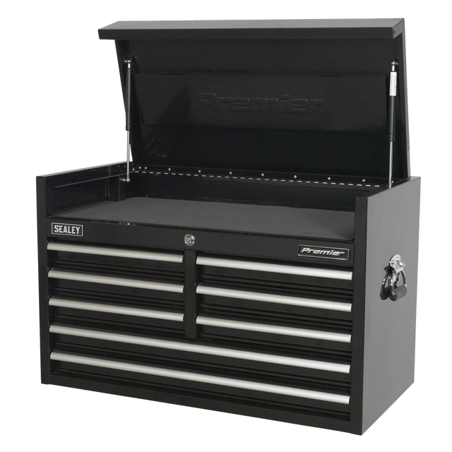Heavy-duty welded steel construction for strength and durability. Textured powder coat finish, both solvent and rust resistant. Ball bearing drawer slides provide superior performance and carry heavier loads, double sets on large drawers. All drawers have full width sand blasted aluminium 'Lift & Latch' drawer pulls, making easy access while preventing inadvertent opening when box is being moved. Heavy-duty exterior handles. Non-slip drawer liners supplied for all drawers. Gas struts fitted to lid makes opening easy. Integral locking system locks all drawers with the turn of a key. Supplied with two keys. Use with Model No. PTB93006 Rollcab or can be a stand alone unit.