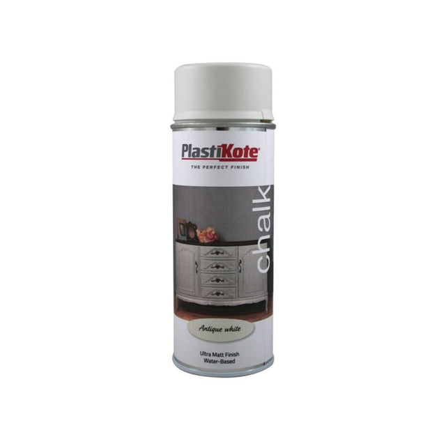 PlastiKote Chalk Spray Paint 400ml Antique White Chalk is the new decorative spray paint from PlastiKote. It gives a vintage look to furniture, mirrors, picture frames and ornaments. Available in a range of ten heritage colours, its easy to apply and gives that flat, chalky finish that consumers love. Chalk has been specially developed using PlastiKotes new water based technology so its kinder to the environment, kind to the home and has no solvent smell! It has a gentle spray mist action, works on virtually any surface, indoor and outdoors, and is easily sanded when dry for a distressed finish.