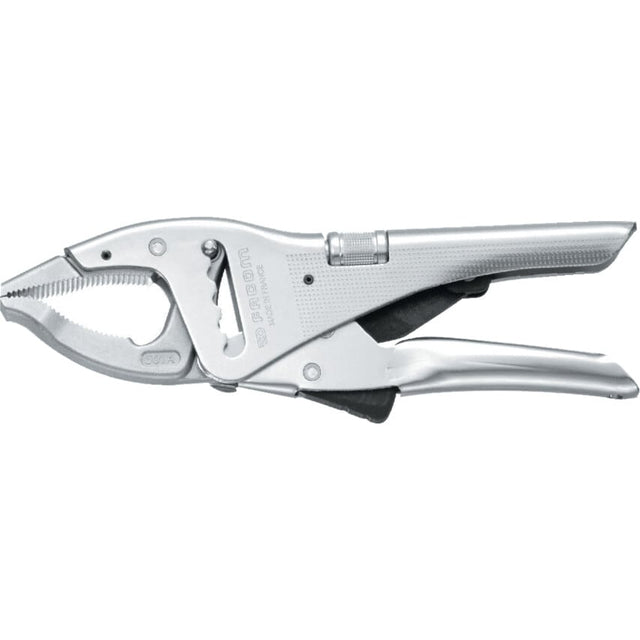 501A - 5 position slip joint system. Unlock trigger allowing smooth and safe release. Easy to use and secure. Usable with one hand. Machined groove in upper jaw holds small round sections. Chromed finish.