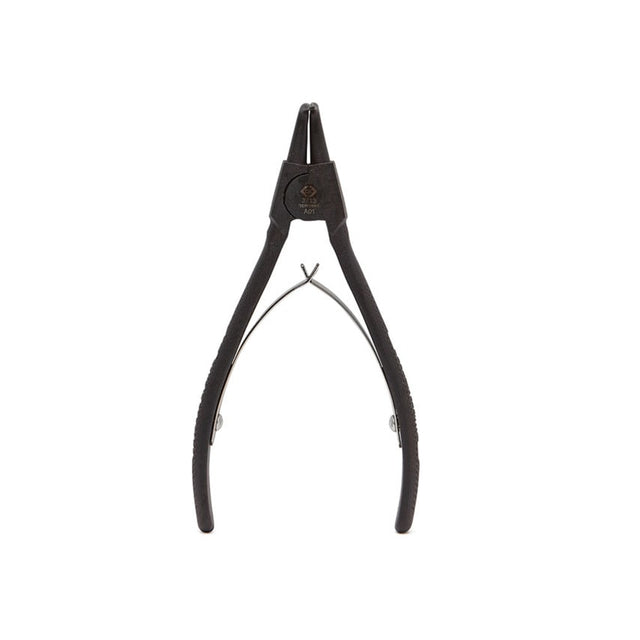 Industrial quality bent external circlip pliers with spring return. Manufactured from hardened and tempered chrome vanadium steel.