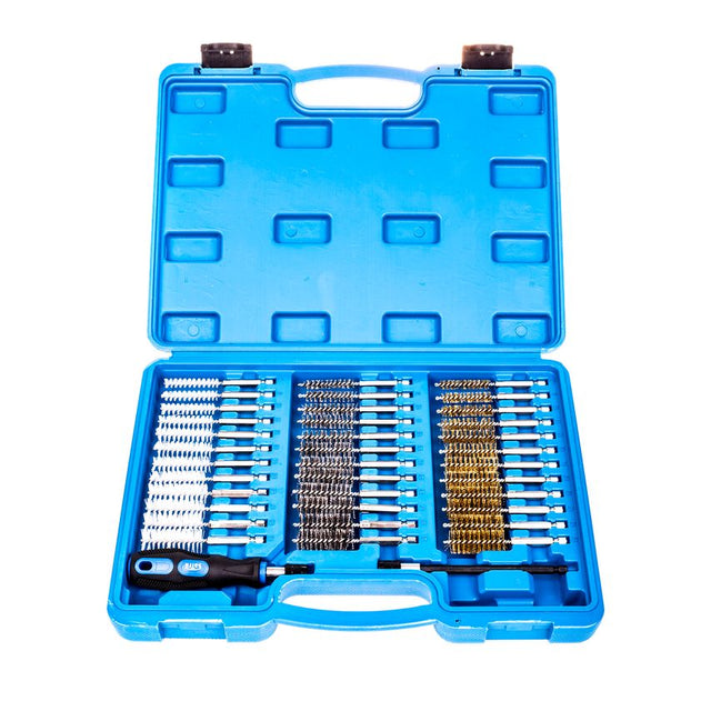 38pc universal hand brush injector seat or glow plug cleaning or decarbonising set to use before installing a new injector or glow plug on a wide range of vehicles with diesel engine. Brush can be attach to the handle directly or via an extension if necessary, thanks to this it will get to hard to reach areas easier. Set includes 12 different size brushes made of nylon, stainless steel, brass as well as 1/4" hex screwdriver extension bit holder (150mm) and a handle (140mm) Brush diameter 8, 9, 10, 11, 12, 13, 14, 15, 16, 17, 18, 19mm with overall length of 100mm. Supplied in carry case.