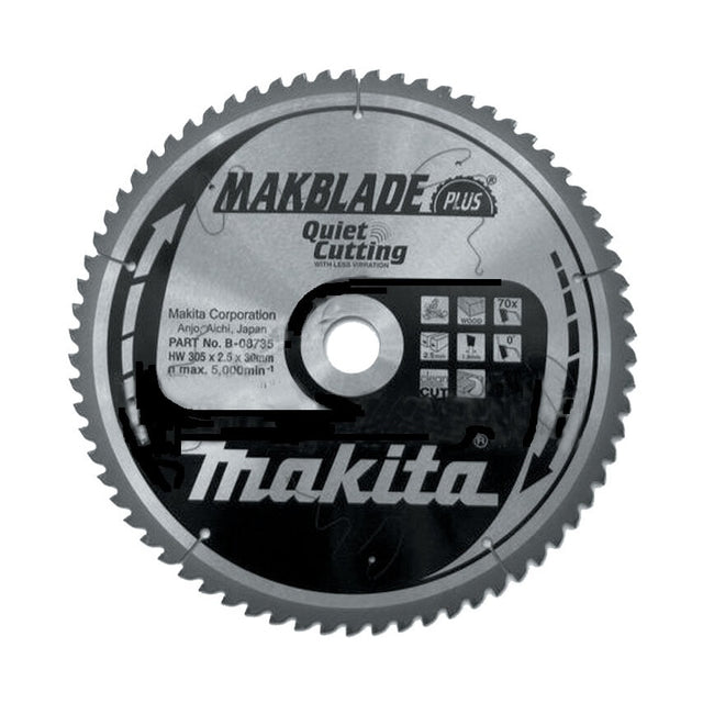 B-08735 305mm blade with specially formulated carbide tips precision ground for fast clean cutting. Developed to dampen vibration and be super quiet. Dimensions: 305 x 30mm x 70T. Bore: 30mm. Kerf: 2.5mm Rake: 0. Thickness: 1.9mm.