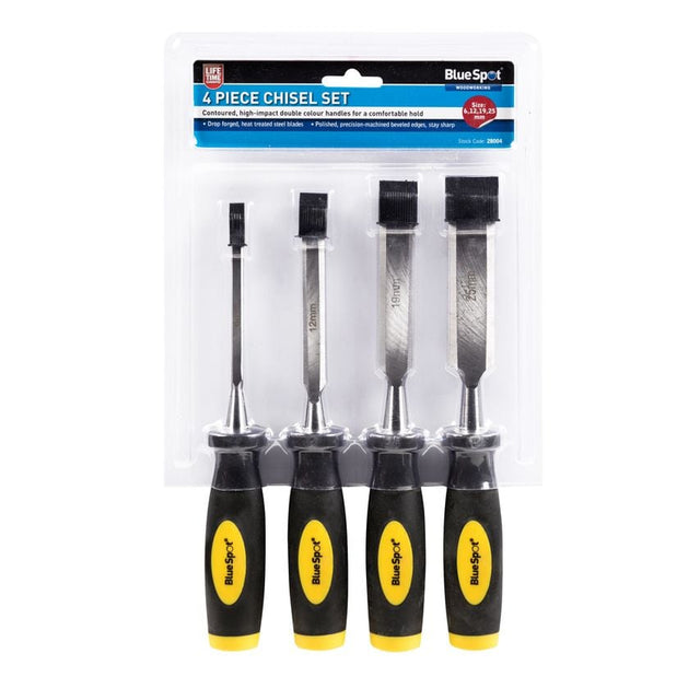 The Blue Spot Tools 4 Piece Chisel Set is manufactured from drop forged and heat-treated steel for increased durability. Features ergonomic handles for increased comfort. Precision machined bevelled edges for accurate striking.