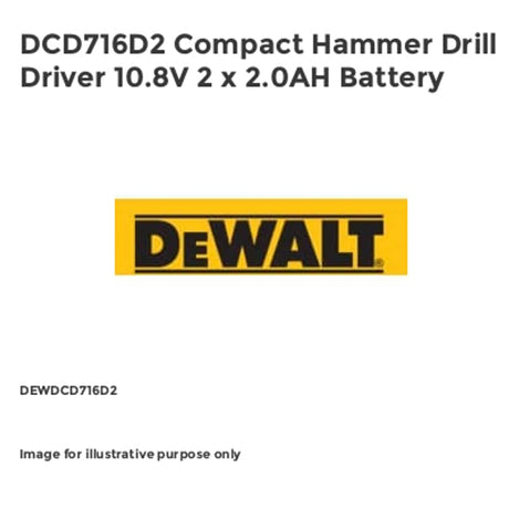 Low stock (10 units)£285.99Unit price /UnavailableDCD716D2 Compact Hammer Drill Driver 10.8V 2 x 2.0AH Battery DEWDCD716D2