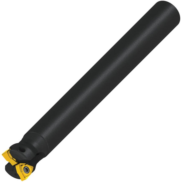 Copy face mill with double negative geometry utilising 2 double-sided inserts. Cutting diameter of 16mm with a 90 approach angle and a 14mm parallel shank according to DIN 1835A. 140mm functional and, through coolant for face milling, shallow shoulder milling, deep shoulder milling, plunge milling, copy milling and ramping with a maximum depth of cut of 0,5 (2,0)mm.