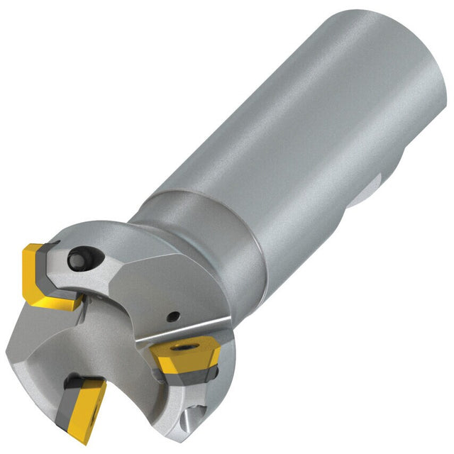 Face mill with positive/negative geometry utilising 3 single-sided inserts. Cutting diameter of between 40mm and 53.5mm with a 45 approach angle and a 32mm Weldon shank according to DIN 1835B. 45mm usable and 120mm overall length, through coolant for face milling and chamfering with a maximum depth of cut of 6.4mm.