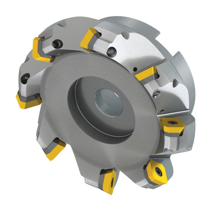 Nickelized steel face mill with positive/negative geometry utilising 8 single-sided inserts. Cutting diameter ranges from 100mm to 112.9mm with a 45 approach angle and a 32mm connection bore according to DIN 8030-A. 50mm functional and, through coolant and differential pitch for face milling and chamfering with a maximum depth of cut of 6.4mm.