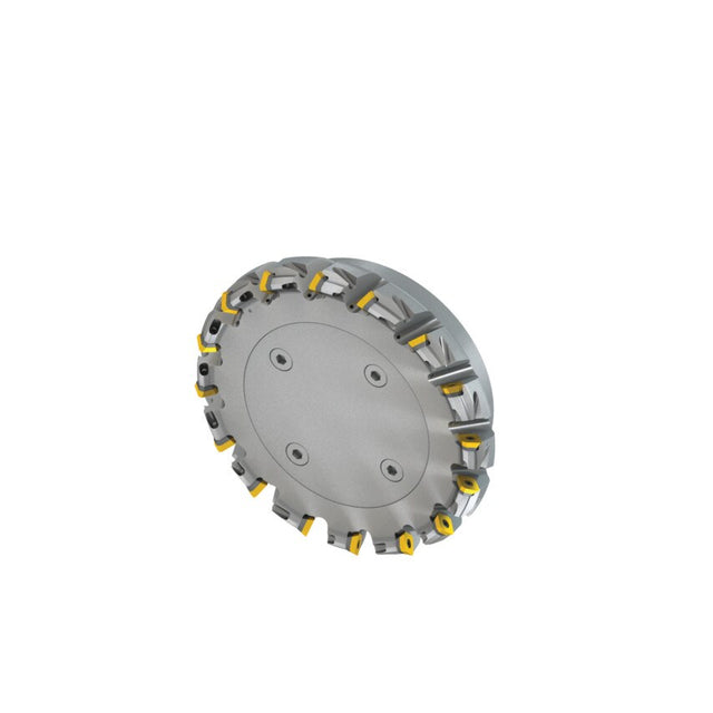 Face mill with positive/negative geometry utilising 12 single-sided inserts. Cutting diameter ranges from 200mm to 212.8mm with a 45 approach angle and a 60mm connection bore according to DIN 8030-C. 63mm functional and, through coolant and differential pitch for face milling and chamfering with a maximum depth of cut of 6.4mm.