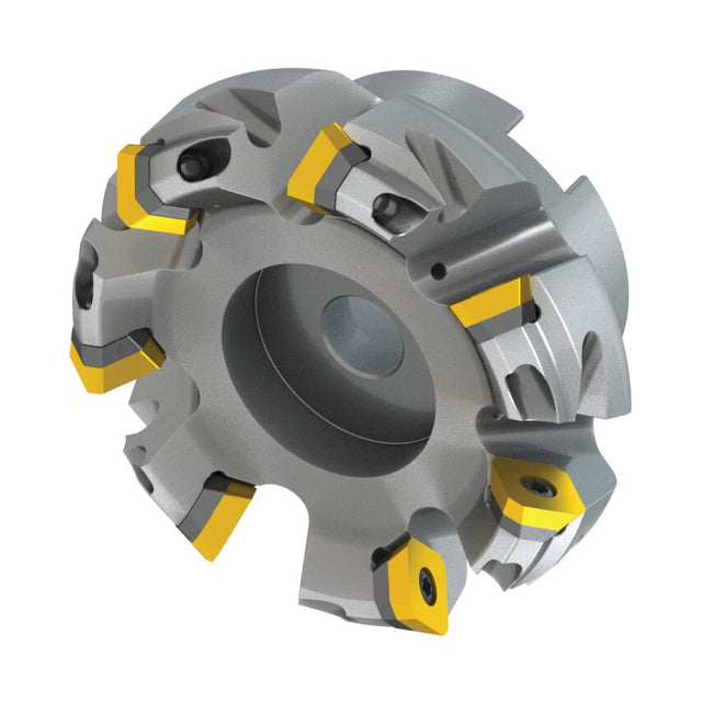Face mill with positive/negative geometry utilising 7 single-sided inserts. Cutting diameter ranges from 80mm to 93.4mm with a 45 approach angle and a 27mm connection bore according to DIN 8030-A. 50mm functional and, through coolant and differential pitch for face milling and chamfering with a maximum depth of cut of 6.4mm.