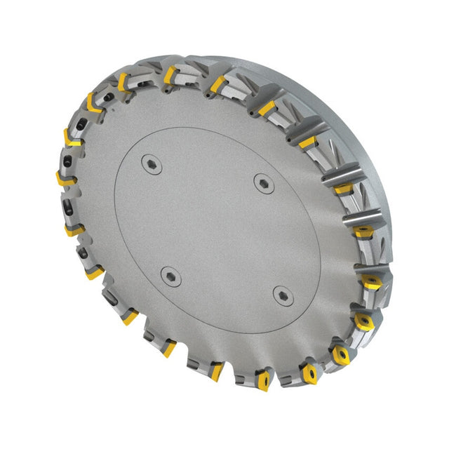 Face mill with positive/negative geometry utilising 20 single sided inserts. Cutting diameter ranges from 250mm to 262.8mm with a 45 approach angle and a 60mm connection bore according to DIN 8030-C. 63mm functional and, through coolant and differential pitch for face milling and chamfering with a maximum depth of cut of 6.4mm.