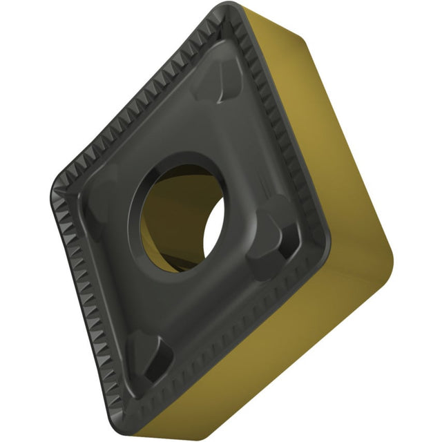 These double-sided 80 rhomboid CNMM turning inserts have a negative insert geometry and were designed for the medium to extra heavy machining of steels. The inscribed circle has a diameter of 25.4mm, 9.52mm thickness, and a 2.4mm nose radius