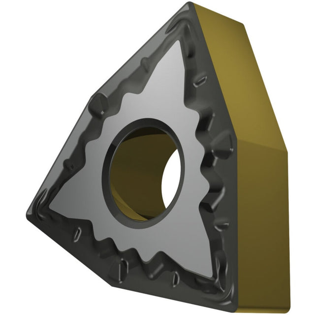 These double-sided trigon WNMG turning inserts have a negative insert geometry and were designed for the fine to heavy machining of cast steels and steel. The inscribed circle has a diameter of 9.525mm, 4.76mm thickness, and 1.2mm nose radius.