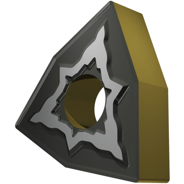 These double-sided trigon WNMG turning inserts have a negative insert geometry and were designed for the fine to heavy machining of cast steels and steel. The inscribed circle has a diameter of 9.525mm, 4.76mm thickness, and 1.2mm nose radius. Features and Benefits Each insert is of the highest coated turning grade, bringing greater stability and performance in a variety of cutting conditions Thicker coating significantly improves tool durability and increases productivity by allowing for higher cutting speeds Processed post-treatment to improve the toughness and reliability of cutting-edge Typical Applications Cast steel Steel
