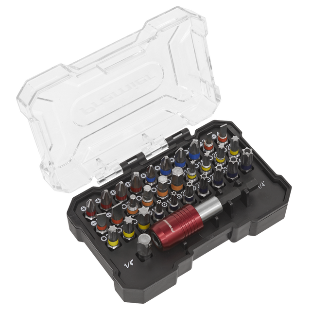 Contents: Slotted; 3, 4, 5, 6, Phillips; #1, #2 (x2), #3, Pozi; #1, #2 (x2), #3, TRX-Star*; T10, T15, T20, T25, T27, T30, T40, Security TRX-Star*; T10H, T15H, T20H, T25H, T27H, T30H, T40H, Hex; 3, 4, 5, 6, 1/4"Sq Drive Adaptor, 65mm Quick Release Bit Holder.