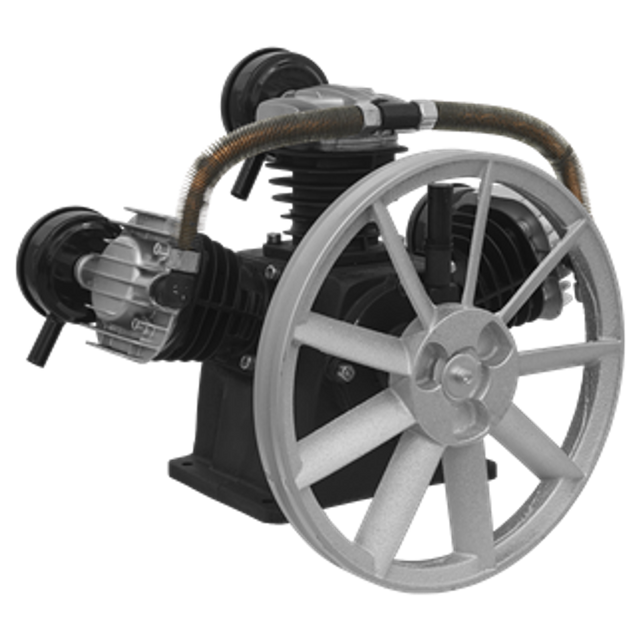 Minimum rated motor power is 3hp. Finned flywheel designed to aid pump cooling. Heavy-duty full cast cylinders, capped by alloy heads for improved heat dissipation and long-life.