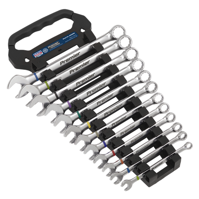High quality slim style Chrome Vanadium steel spanners. Hardened and tempered with a fully polished micro satin finish. Colour-coded for fast identification. Anti-slip hex configuration on the open-ends. Supplied in storage/carry rack.
