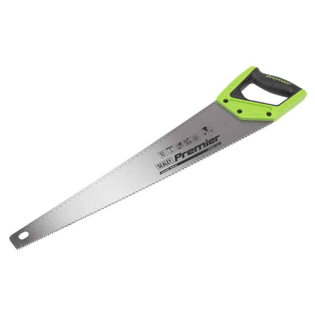 ABS and TPR anti-slip soft grip handle with finger rest for comfort and control. 1mm 65Mn High grade carbon steel blade. Hardened and tempered double ground teeth for fast and efficient cutting. Lacquered coating for reduced friction and corrosion resistance. 45 and 90 angle guides integrated into handle with useful ruler markings along top edge of blade. General-purpose 7 TPI blade suitable for timber, hardwood, MDF, chipboard and plastics.