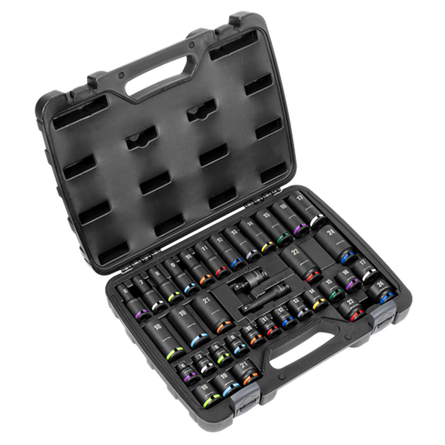 Contents: Standard Sockets; 6, 7, 8, 9, 10, 11, 12, 13, 14, 15, 16, 17, 18, 19, 21, 22, 24mm, Deep Sockets; 6, 7, 8, 9, 10, 11, 12, 13, 14, 15, 16, 17, 18, 19, 21, 22, 24mm, 75mm Extension Bar, Universal Joint.