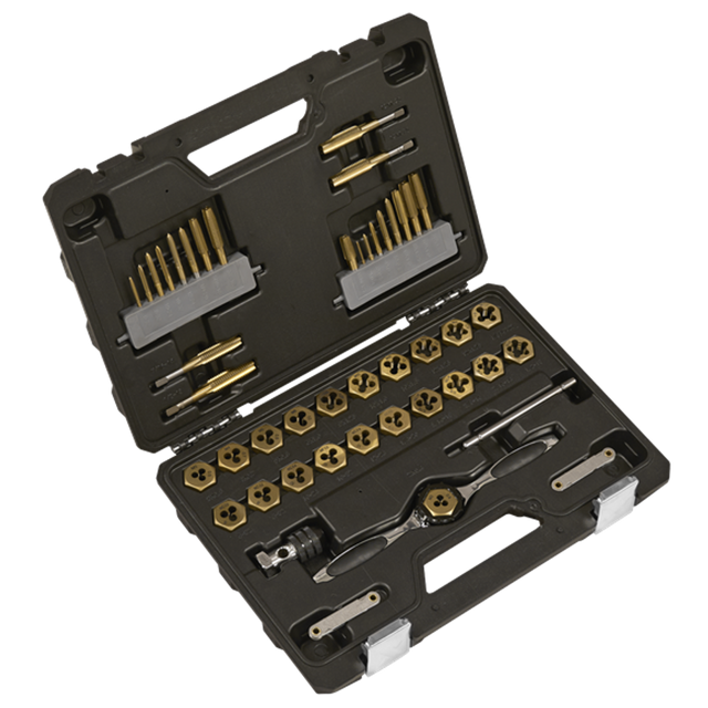M2 to M12 high quality titanium coated taps and dies. Set contains both Metric and Imperial sizes. Features hex shaped dies providing a more secure fit in the die holder. Dies can also be used with a socket or spanner. Supplied in storage case.