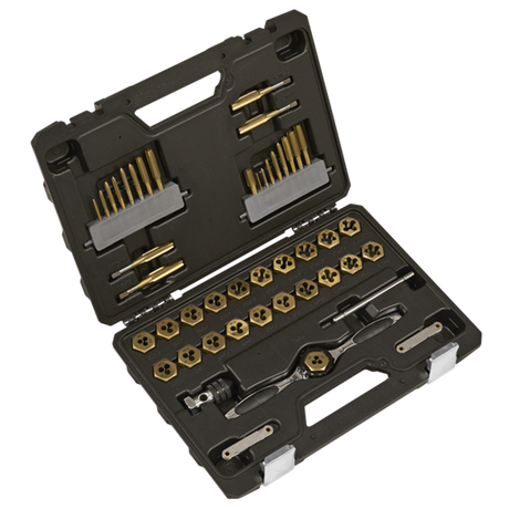 Low stock (10 units)£12.09Unit price /UnavailableMetric & SAE/Imperial Titanium Coated Hexagonal Tap and Die Set 46 Piece