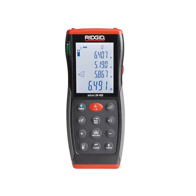 The RIDGID Micro LM-400 Advanced Laser Distance Measure features Bluetooth technology, allowing it to be connected to smartphones and tablets to easily view, store and share data. This helps to avoid time-consuming paperwork and costly writing errors. Android and iOS Apps easily and quickly transfer and overlay measurements from the Micro LM-400 onto a photo or sketch. The LM-400 has an easy-to-read backlit 4-line display. It has a long measuring range of up to 7m and can measure angles of up to 65. Its inclination sensor can provide instant simultaneous horizontal, vertical and diagonal distance measurements. Functions Distance, Volume and area calculation, Addition and subtraction, Continuous measurement, Stake out, Self-triggering timer, Indirect measurements, Angle measurements, Bluetooth connection, Transfer/overlay data to sketches and RIDGIDSketch App for iOS and Android. Specification Accuracy & plusmn1.5mm. Operating Range 70m. Power 2 x AAA batteries (supplied). Protection Class IP54 (dust & water splash).