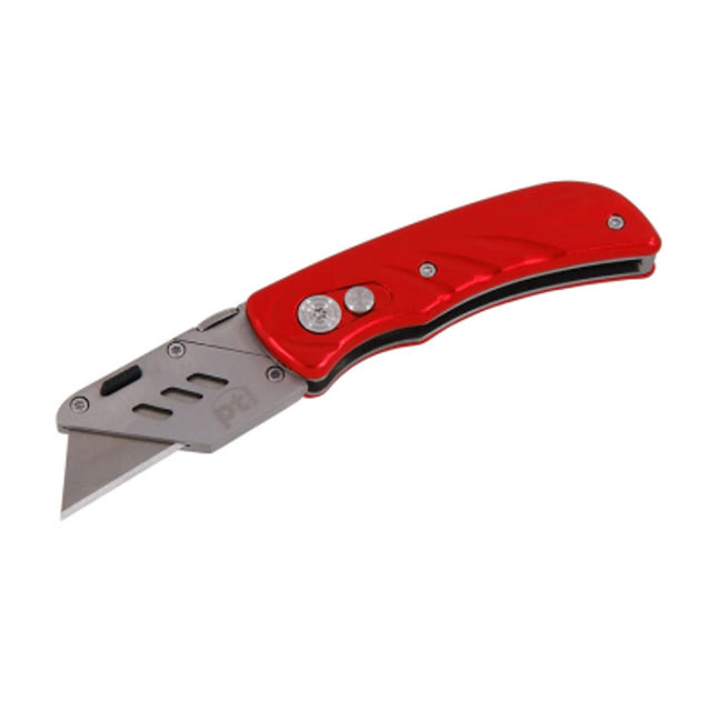This compact lightweight folding utility knife features a blade locking system and an easy blade change mechanism and a belt clip for added mobility and saving time in demanding work conditions. Its one hand, easy opening makes it convenient to use. One-handed locking button opens and folds away the blade for increased safety. Belt clip for convenient carrying. Suitable for use with standard utility blades. Easy access button for rapid quick blade change. Rugged stainless steel metal body for long tool life. Ergonomic and comfortable to use. Available in a display box when ordering 16 knives. Folded closed length: 100mm (4). Overall open length: 155mm (6).