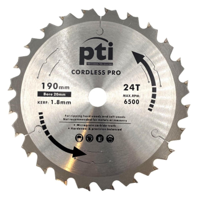 Robust Professional quality TCT Circular Saw Blade. Hardened and precision balanced Micrograin Carbide Teeth for precision cutting on softwood, hardwood, MDF, plywood, fibreboard, sandwich panels etc. Features: Extra sharp oversized carbide teeth are precision tensioned for flawless cuts High quality steel used for high performance and long life Professional Quality Steel reduces vibration for a cleaner cut Thin kerf Blades for use on Cordless Saws Ultra thin body and thin kerf design enables more cuts per battery charge by reducing battery drain Designed to help noise reduction Can be re-sharpened Specification: Diameter: 190mm Teeth: 24T Bore: 20mm Kerf: 1.8mm Max RPM: 6500