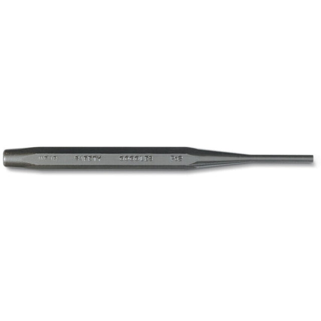 One-piece design for strength and durability. Reverse taper to help prevent binding. Made from S2 steel and specially heat-treated for greater strength and durability. Modified parabolic striking end to help reduce mushrooming and chipping. Black oxide finish to help prevent rust corrosion; extending tool life and performance. A polished identification panel on one of the flats is marked with the tool number and size in a black inlay.