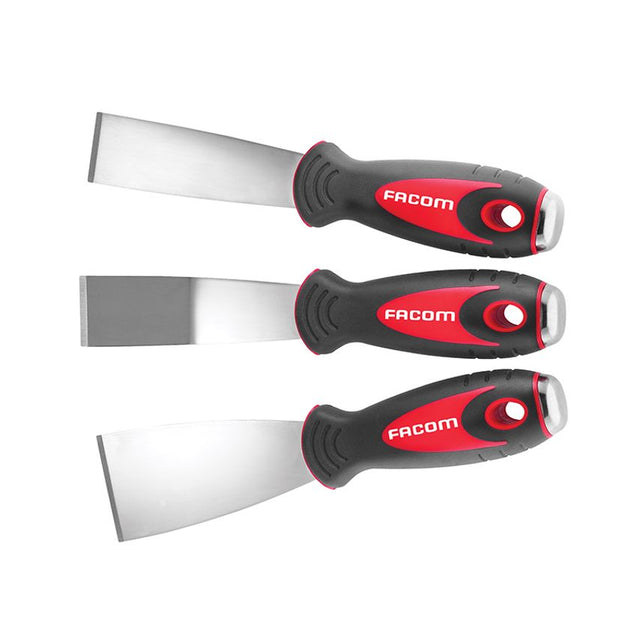 Set of 3 Facom stainless steel scrapers fitted with ergonomic handles, and reinforced striking zones. The 0.8mm thick blades are made from durable stainless steel. Contents 1 x Straight scraper, 32mm width. 1 x Straight scraper, 50mm width. 1 x Angled scraper, 32mm width.