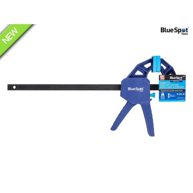 The Blue Spot Tools Heavy-Duty Ratchet Speed Clamp & Spreader is manufactured from durable reinforced nylon and has a heat-treated carbon steel bar. With a quick slide function to clamp the workpiece without needing to pull the trigger numerous times to close on your work, simply slide the clamp head down the bar and then tighten fully with the trigger. Non-marring pads protect the workpiece and offer a firm grip. Easy to switch between the clamp and spreading function by reversing the front jaw. Strong and lightweight. With a sturdy pistol grip for quick and easy use. Ideal for woodworking, metalwork and other situations where a high clamping force is required.