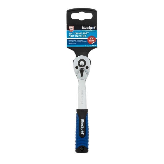 The BlueSpot 1/4" 72 Tooth Soft Grip Ratchet is manufactured from chrome vanadium for increased durability. Features a soft grip handle for increased comfort. The 72 teeth provide 5 ratcheting increments making it ideal for use in tight spaces.