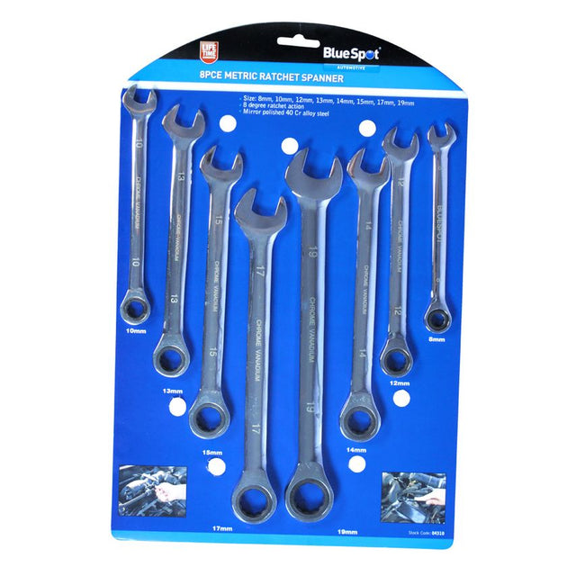 The BlueSpot 8 PCE Metric Ratchet Spanner Set is manufactured from chrome vanadium, heat treated and nickel plated for increased durability. 5 ratcheting increments make this set ideal for use in tight spaces. Fully polished mirror finish.