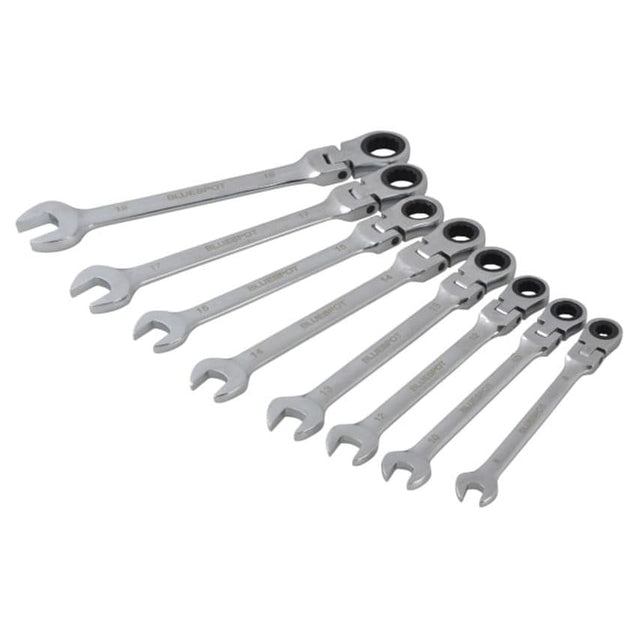 The BlueSpot Flexible Ratchet Spanners feature 180 pivoting ratchet ring heads. Manufactured from chrome vanadium steel, heat treated and nickel plated for increased durability. They have a fully polished mirror finish. With 8 ratcheting increments to make the set ideal for use in tight spaces.
