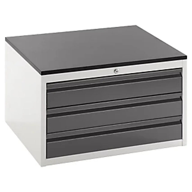 Drawer cupboard with telescopic guides, height 460 mm, 3 x 120 mm drawers, light grey/charcoal, width 770 mm. Supplied = assembled. Height = 460 mm. Width = 770 mm. Depth = 650 mm. Max. drawer load = 100 kg. Number of drawers = 3 pcs. Drawer height = 3x120 mm. Drawer extension = 100%. Body colour = light grey RAL 7035. Front colour = charcoal metallic. Fittings = individual pull-out stop. Material = sheet steel, powder coated. Drawer guide = with drawers on ball bearing telescopic runners. Lock type = central locking with cylinder lock. High max. drawer load of 100 kg. Telescopic rails with self-retraction and non-return system. Improved anti-tipping properties due to individual pull-out stop (when one drawer is open, all other drawers are blocked) Cylinder lock with central locking. Sturdy, torsion-free sheet steel construction. High quality powder coating. Body always in light grey RAL 7035. Self-closing drawers, retract gently into housing. Attractive cupboard top with 20 mm thick, melamine coated cover panel (splashproof and dirt-resistant, stain-resistant, hardwearing) Depth 650 mm. Available at no extra charge: 15 colours - up to 225 colour combinations Your advantage Can be used individually or set up in rows. Can be expanded to create a workbench.