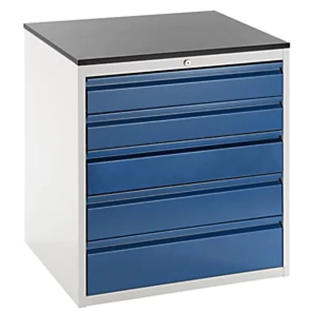 Drawer cupboard with telescopic guides, height 820 mm, drawers: 2 x 120, 2 x 150, 1 x 180 mm, light grey/gentian blue, width 770 mm. Supplied = assembled. Height = 820 mm. Width = 770 mm. Depth = 650 mm. Max. drawer load = 100 kg. Number of drawers = 5 pcs. Drawer height = 2x120, 2x150, 1x180 mm. Drawer extension = 100%. Body colour = light grey RAL 7035. Front colour = gentian blue RAL 5010. Fittings = individual pull-out stop. Material = sheet steel, powder coated. Drawer guide = with drawers on ball bearing telescopic runners. Lock type = central locking with cylinder lock. High max. drawer load of 100 kg. Telescopic rails with self-retraction and non-return system. Improved anti-tipping properties due to individual pull-out stop (when one drawer is open, all other drawers are blocked) Cylinder lock with central locking. Sturdy, torsion-free sheet steel construction. High quality powder coating. Body always in light grey RAL 7035. Self-closing drawers, retract gently into housing. Attractive cupboard top with 20 mm thick, melamine coated cover panel (splashproof and dirt-resistant, stain-resistant, hardwearing) Depth 650 mm. Available at no extra charge: 15 colours - up to 225 colour combinations Your advantage Can be used individually or set up in rows. Can be expanded to create a workbench.
