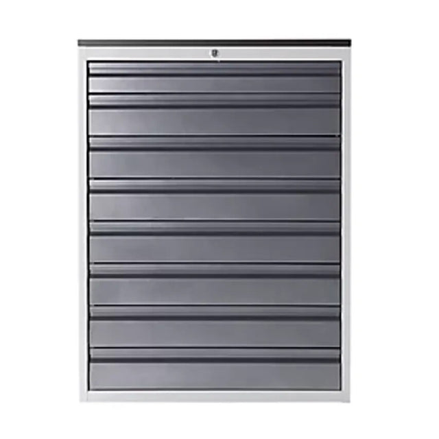 Drawer cupboard with telescopic guides, height 1030 mm, drawers: 1 x 90, 7 x 120 mm, light grey/gentian blue, width 770 mm. Supplied = assembled. Height = 1030 mm. Width = 770 mm. Depth = 650 mm. Max. drawer load = 100 kg. Number of drawers = 8 pcs. Drawer height = 1x90, 7x120 mm. Drawer extension = 100%. Body colour = light grey RAL 7035. Front colour = gentian blue RAL 5010. Fittings = individual pull-out stop. Material = sheet steel, powder coated. Drawer guide = with drawers on ball bearing telescopic runners. Lock type = central locking with cylinder lock. High max. drawer load of 100 kg. Telescopic rails with self-retraction and non-return system. Improved anti-tipping properties due to individual pull-out stop (when one drawer is open, all other drawers are blocked) Cylinder lock with central locking. Sturdy, torsion-free sheet steel construction. High quality powder coating. Body always in light grey RAL 7035. Self-closing drawers, retract gently into housing. Attractive cupboard top with 20 mm thick, melamine coated cover panel (splashproof and dirt-resistant, stain-resistant, hardwearing) Depth 650 mm. Available at no extra charge: 15 colours - up to 225 colour combinations Your advantage Can be used individually or set up in rows. Can be expanded to create a workbench.