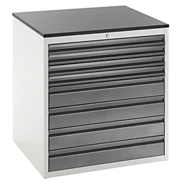 Drawer cupboard with telescopic guides, height 820 mm, drawers: 4 x 60, 4 x 120 mm, light grey/charcoal, width 770 mm. Supplied = assembled. Height = 820 mm. Width = 770 mm. Depth = 650 mm. Max. drawer load = 100 kg. Number of drawers = 8 pcs. Drawer height = 4x60, 4x120 mm. Drawer extension = 100%. Body colour = light grey RAL 7035. Front colour = charcoal metallic. Fittings = individual pull-out stop. Material = sheet steel, powder coated. Drawer guide = with drawers on ball bearing telescopic runners. Lock type = central locking with cylinder lock. High max. drawer load of 100 kg. Telescopic rails with self-retraction and non-return system. Improved anti-tipping properties due to individual pull-out stop (when one drawer is open, all other drawers are blocked) Cylinder lock with central locking. Sturdy, torsion-free sheet steel construction. High quality powder coating. Body always in light grey RAL 7035. Self-closing drawers, retract gently into housing. Attractive cupboard top with 20 mm thick, melamine coated cover panel (splashproof and dirt-resistant, stain-resistant, hardwearing) Depth 650 mm. Available at no extra charge: 15 colours - up to 225 colour combinations Your advantage Can be used individually or set up in rows. Can be expanded to create a workbench.