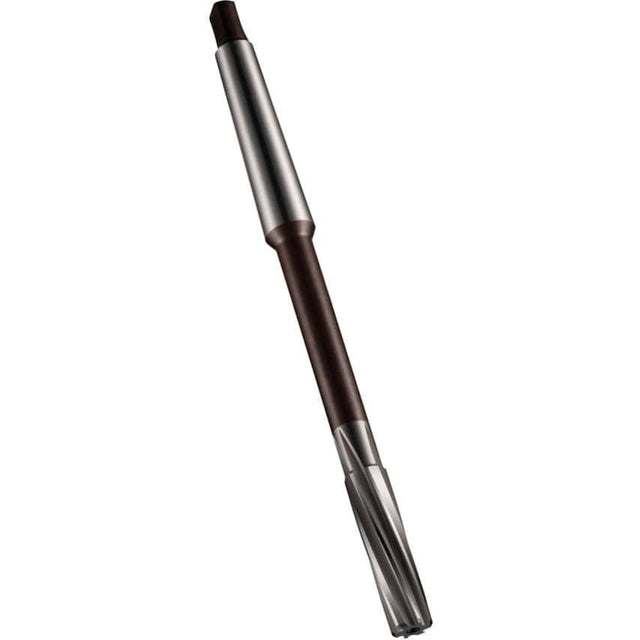 Machine reamer with left hand slow spiral flutes which are extremely unequally spaced and a Morse taper shank
