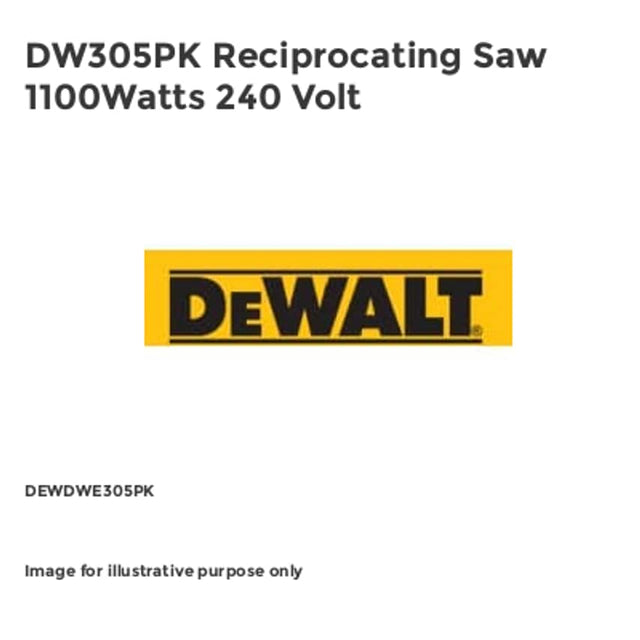 The DEWALT DW305PK Reciprocating Saw is fitted with a motor that has been specifically designed for heavy-duty applications, a 4 position blade clamp allows for flush cutting and increased versatility. It has a 29mm stroke length, the DWE305PK delivers excellent cutting performance. There is a lever-action keyless blade clamp for quick and easy blade changing. The saw is ideal for plumbers, electricians, heating, HVAC , and builders. Supplied with a heavy-duty carrying case. Specifications: Input Power: 1,100 Watt.No Load Speed: 0-2,800/min. Stroke Length: 29mm.Capacity: Wood 280mm, Steel Sections & Pipes: 100mm, PVC 130mm.Length: 435mm.Height: 178mm.Weight: 3.5kg.