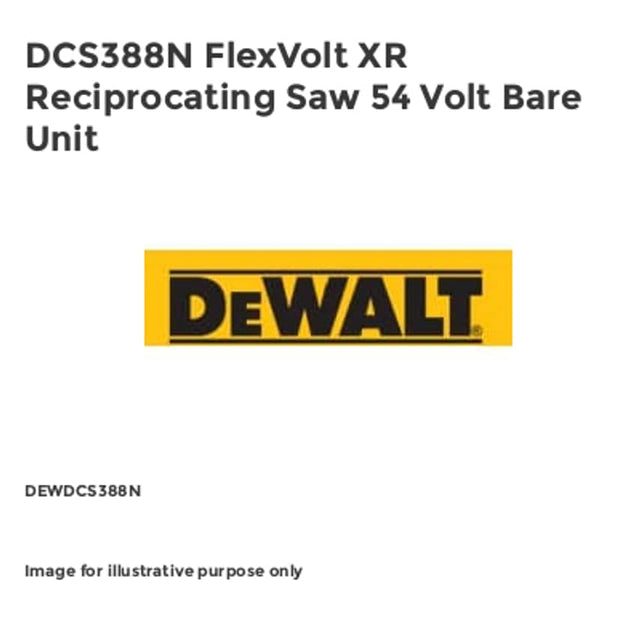 The DEWALT DCS3882 XR FlexVolt Reciprocating Saw offers the same power as a corded machine. The pivoting adjustable shoe with an open top offers high stability and blade visibility during a cut. There is also a lever action, keyless blade clamp for quick and easy blade changes. Variable speed trigger, lock-off switch and electronic motor brake for quick controlled cuts and enhanced work safety. 2 position blade clamp for flush cutting and increased versatility. Specifications: Strokes at No Load: 0-3,000/min.Stroke Length: 28.6mm.Capacity: Wood 300mm, Steel Sections & Pipes 130mm, PVC 160mm.Weight: 3.6kg.