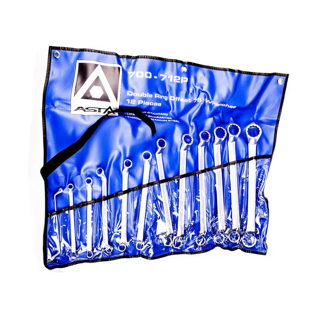 12pc metric deep offset double ended 12 point (12PT) ring spanner set in a handy rolled up storage wallet. Offset at 75 for easier use on flat surfaces and hard to reach areas. Made of hardened and tempered Chrome Vanadium (Cr-V) steel for maximum performance and durability. Matt finish for resistance to corrosion. Also available in EVA foam insert tray for 1/2 drawer (ASTA A-SET6) Supplied in a handy rolled up storage wallet.
