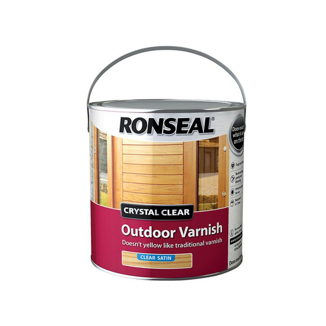 Ronseal Crystal Clear Outdoor Varnish is perfect if you're looking to varnish wood and keep it's natural colour. It'll protect from the weather and doesn't yellow over time like other traditional varnishes. Crystal Clear Outdoor Varnish is rainproof in 1 hour. Before you start make sure it's a warm, dry day (above 10c) and the wood is clean and dry, also make sure you wear a face mask to avoid breathing in any dust. Prep Stained or Varnished Wood give the wood a good sand to make sure the varnish sticks. Then give it a clean with white spirit and leave to dry. Prep New Wood give the wood a light sand, clean any dirt or dust with white spirit and leave to dry. You'll need to put on 3 coats leaving 6 hours between coats. Before the final coat lightly sand the wood, this will help the varnish stick and give a smoother finish. Coverage 16.0m covered per litre. Number of coats 3. Application Brush. Drying Time 1 hour. Ronseal RSLCCODVS25L Crystal Clear Outdoor Varnish Satin 2.5 litre comes in the following Colour Crystal Clear. Finish Satin. Size 2.5 litre.