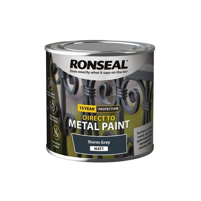Ronseal Direct to Metal Paint is a high-quality, water-based paint that provides a tough and durable finish to metal. It doesnt need a primer and can be applied directly to rust. Quick recoat time and is showerproof in 30 minutes. Paints up to 8m2 per litre. It provides 15-years of protection.