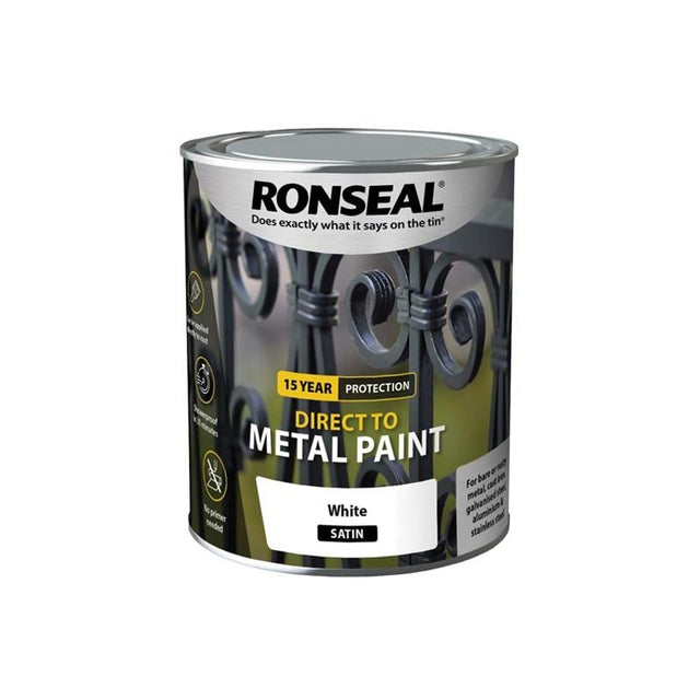 Ronseal Direct to Metal Paint is a high-quality, water-based paint that provides a tough and durable finish to metal. It doesnt need a primer and can be applied directly to rust. Quick recoat time and is showerproof in 30 minutes. Paints up to 8m2 per litre. It provides 15-years of protection.
